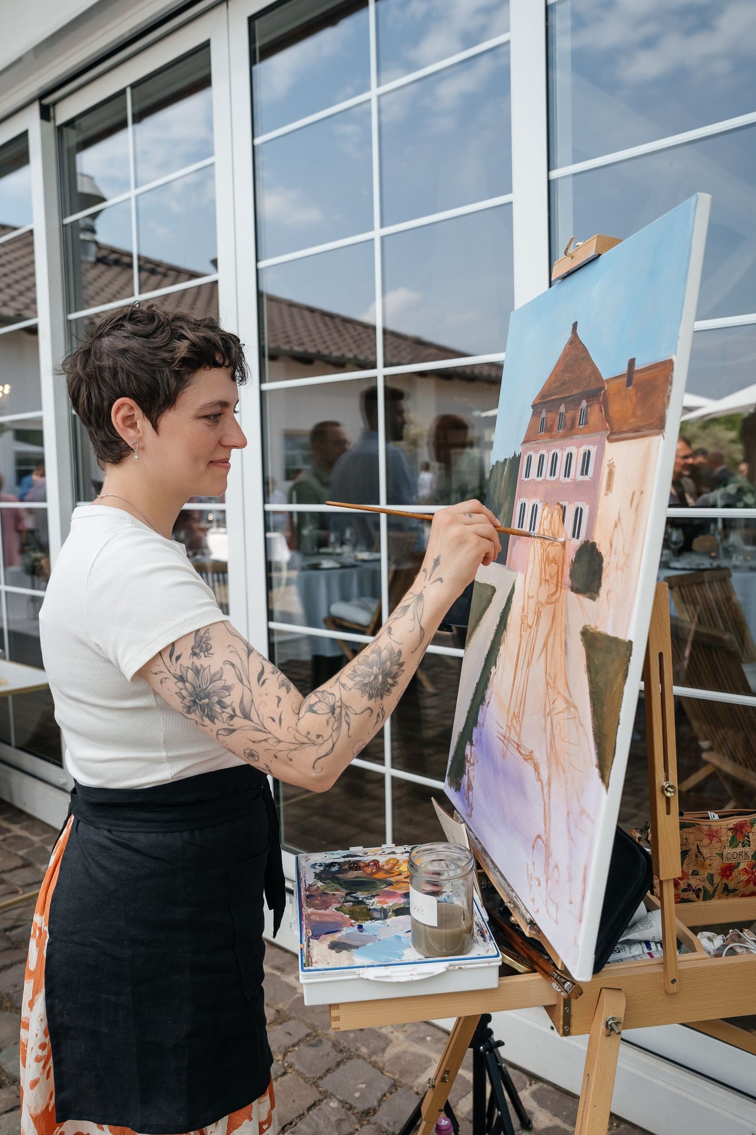 Bis zum abgesprochenen Moment, den ich vom Hochzeitspaar malen soll, widme ich mich dem Hintergrund, sodass die Gäste beim Ankommen bereits erste Pinselstriche sehen.